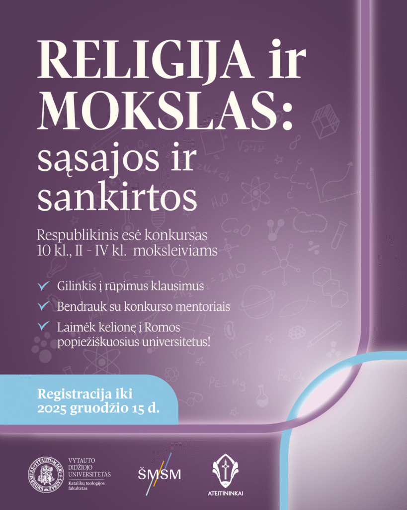 Jei esi 10 kl., II – IV kl. moksleivis, dalyvauk Respublikiniame akademinės esė konkurse “Religija ir mokslas: sąsajos ir sankirtos” ir parodyk savo kūrybiškumą bei kritinį mąstymą!
